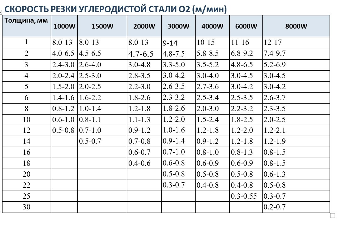 | Толщина металла мм | 1,5 кВт | 3 кВт | 6 кВт | 12 кВт | 15 кВт | 20 кВт |